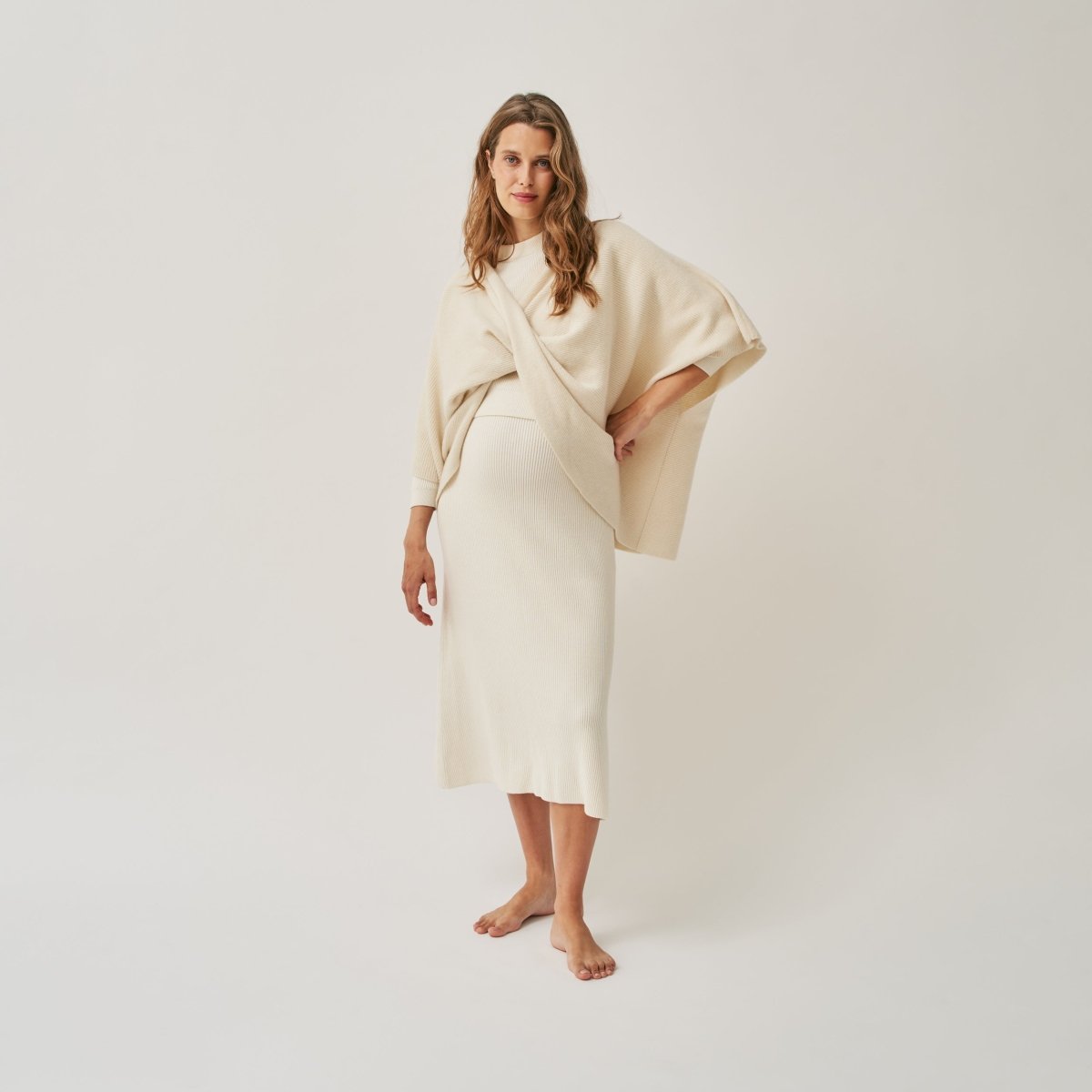 Indulge in luxury and comfort with The Poncho, a beautifully handcrafted piece from Portugal made from premium Fine Merino Wool. This timeless design features a chic twist front detail and an elegant drape, perfect for layering over any outfit to provide cosy warmth that’s both stylish and nursing-friendly.