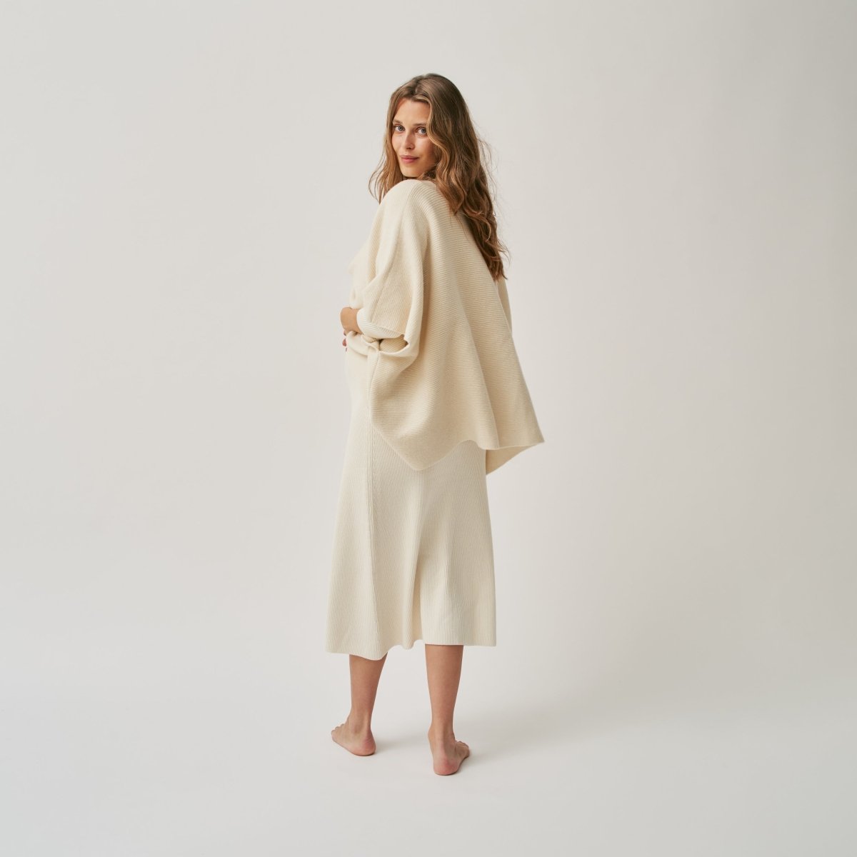 The Poncho is onesize fits all, and is an oversized silhouette with an elegant drape.