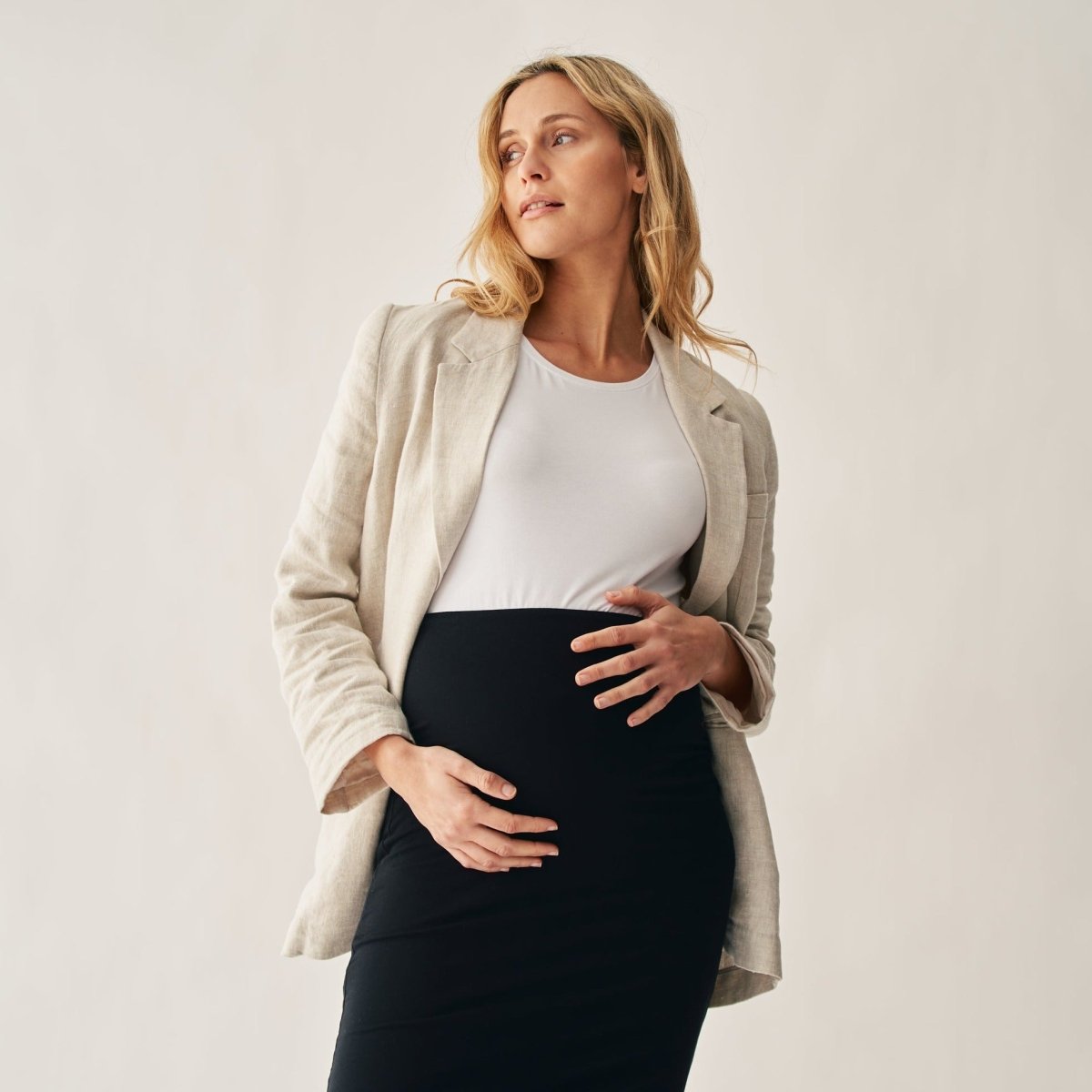 The elegant transition from change table to office desk to evening events, our considered pencil skirt has the potential to elongate silhouettes by both proudly showing off your bump and reclaiming your waist.