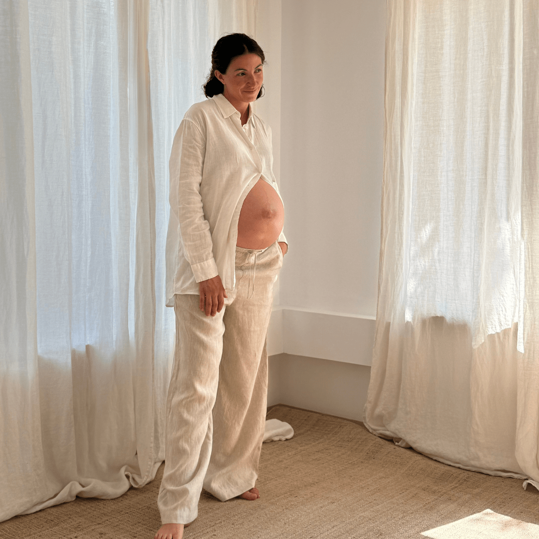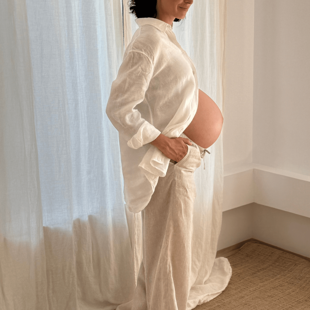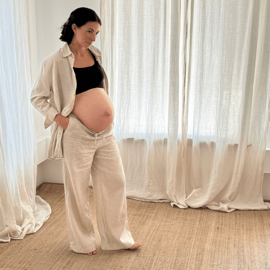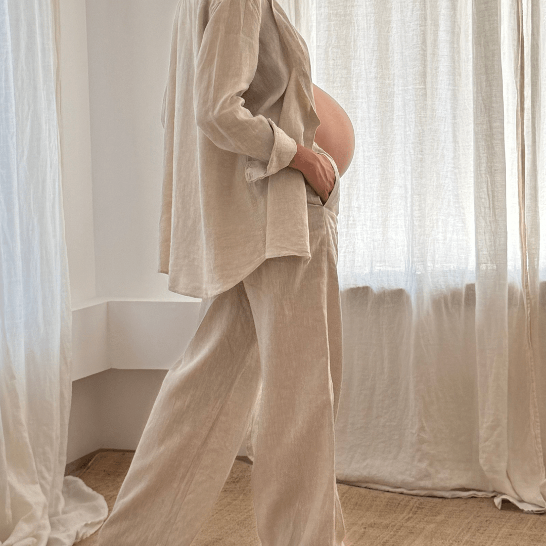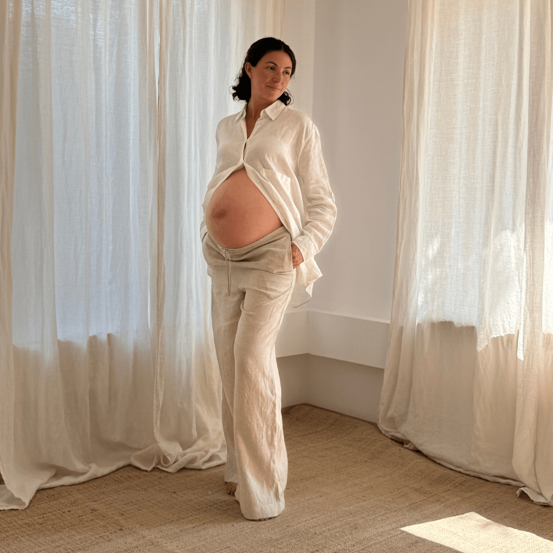 The Wide Leg Linen Pant is a relaxed fit that sits comfortably on the waist, or with the soft elastic waistband under a growing bump.