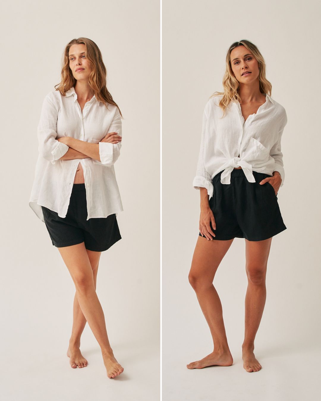 The Linen Short is a relaxed fit that sits comfortably on the waist or with the soft elastic waistband under a growing bump. During pregnancy, we recommend choosing the size up.