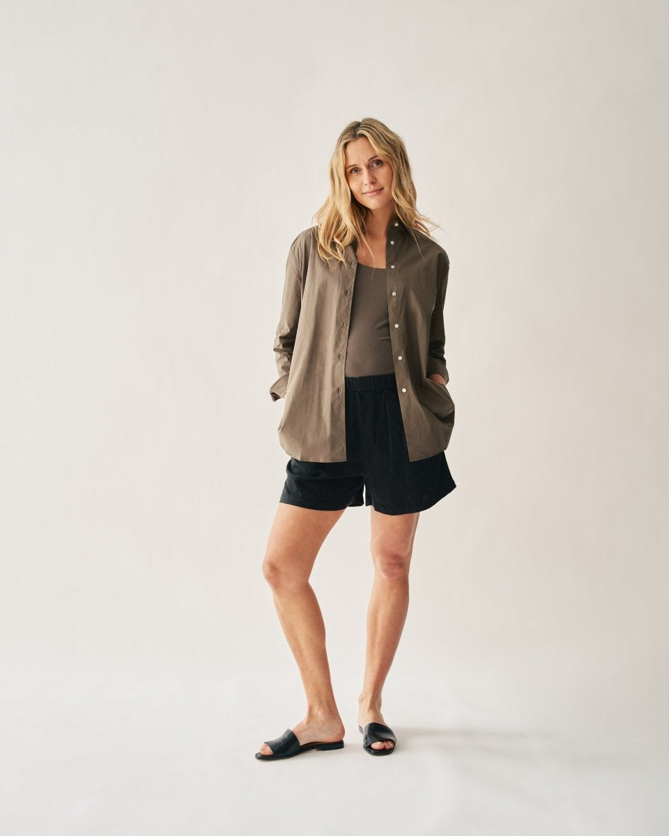 The Linen Short is a summer essential for a relaxed-yet-chic style, with its comfy elastic waistband and flattering A-line shape its a perfect partner for our Oversized Linen Shirt to complete an effortless warm weather style.