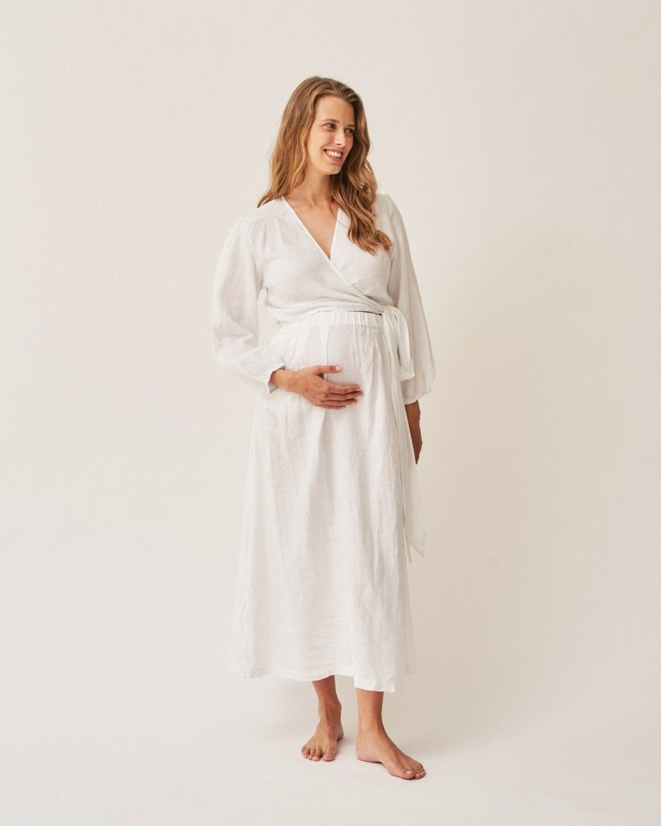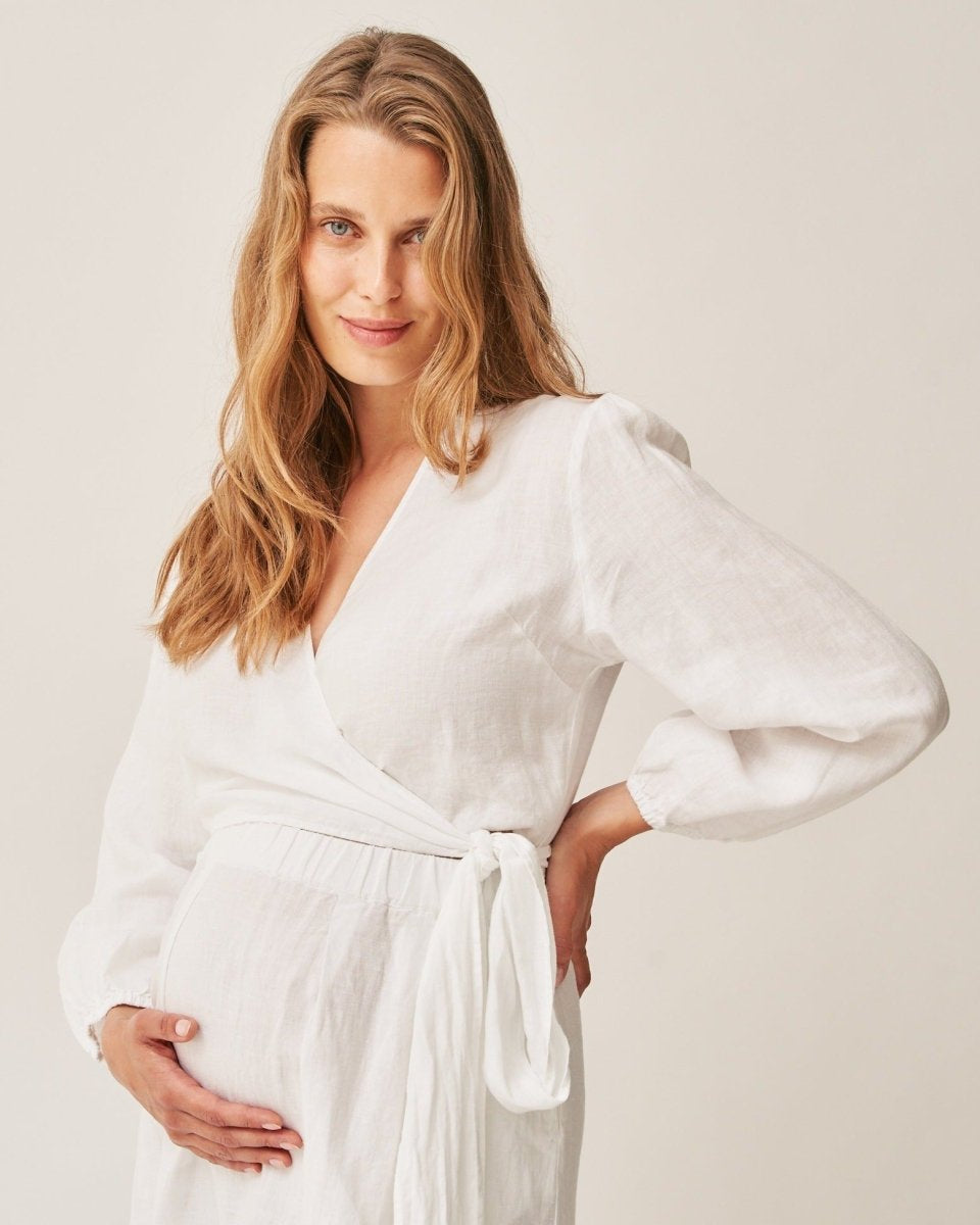 The Linen Wrap Dress features an elastic waistband across the front section to provide a comfortable stretch to accommodate a growing belly or a transitioning waistline post-partum. Simply put the dress on over your head when wearing during pregnancy.
