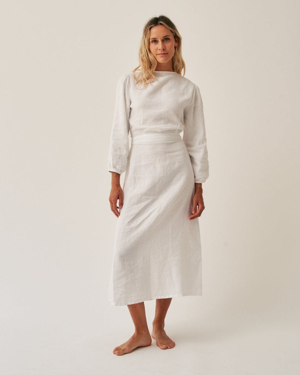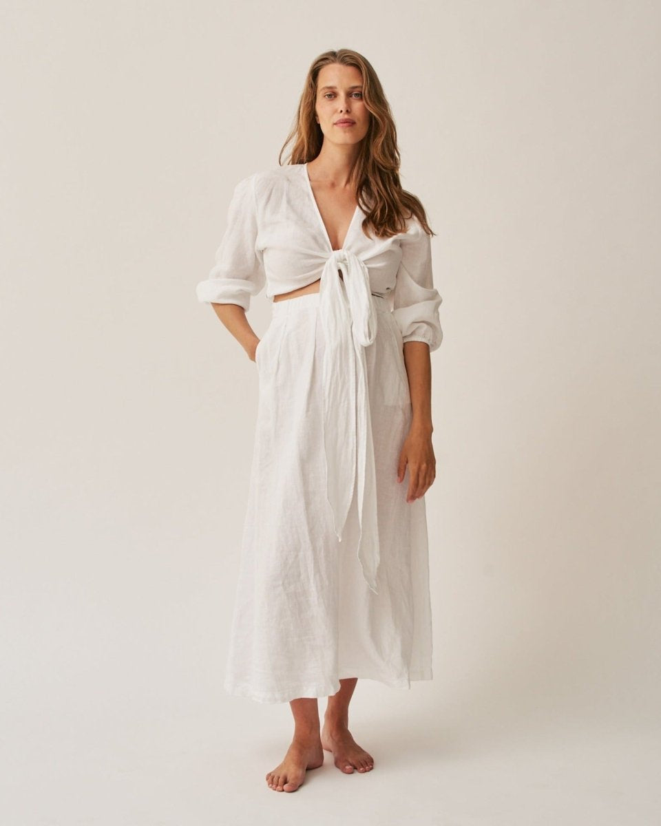 It is a natural feature of linen to contain variances in the fabric. To maintain the beauty of the fabrics drape and movement the garments are unlined. It is recommended that the white linen should be worn with natural coloured underwear.