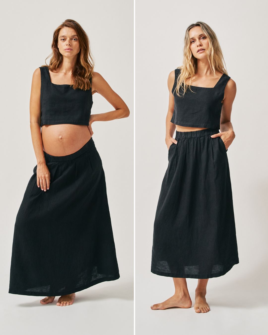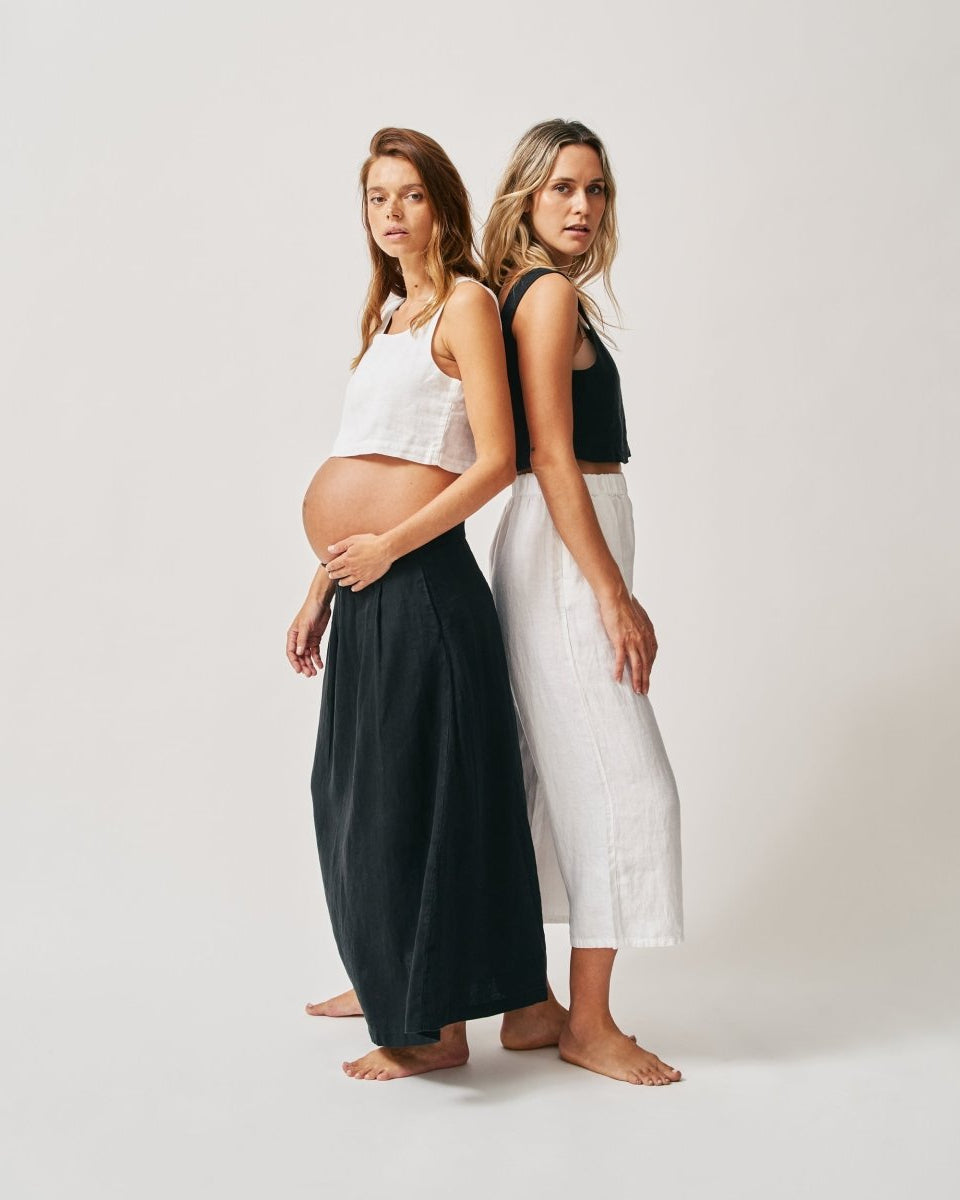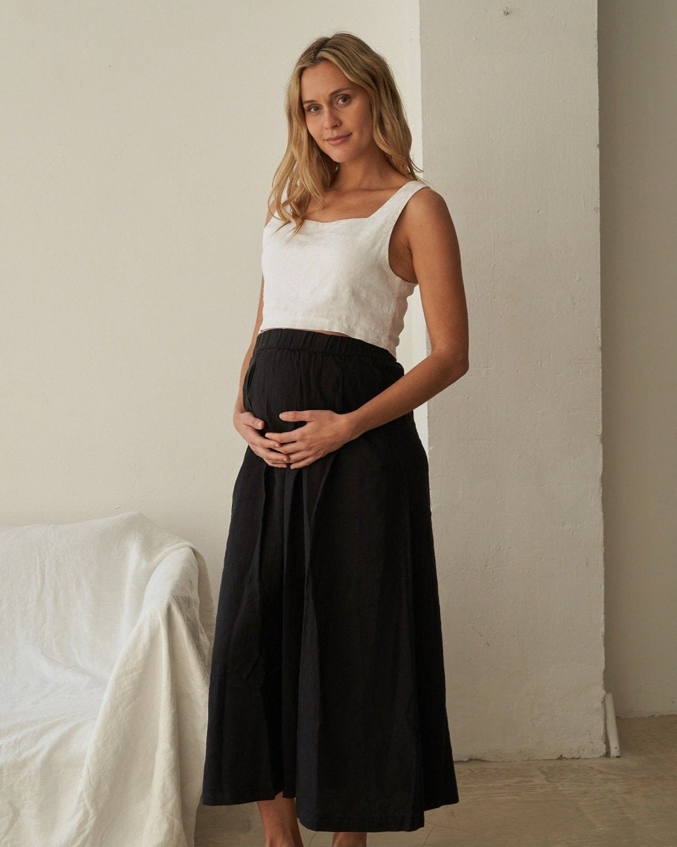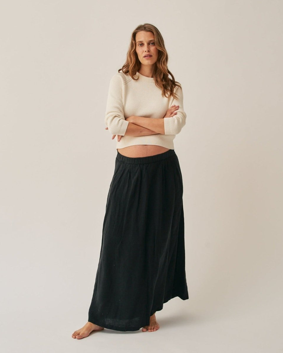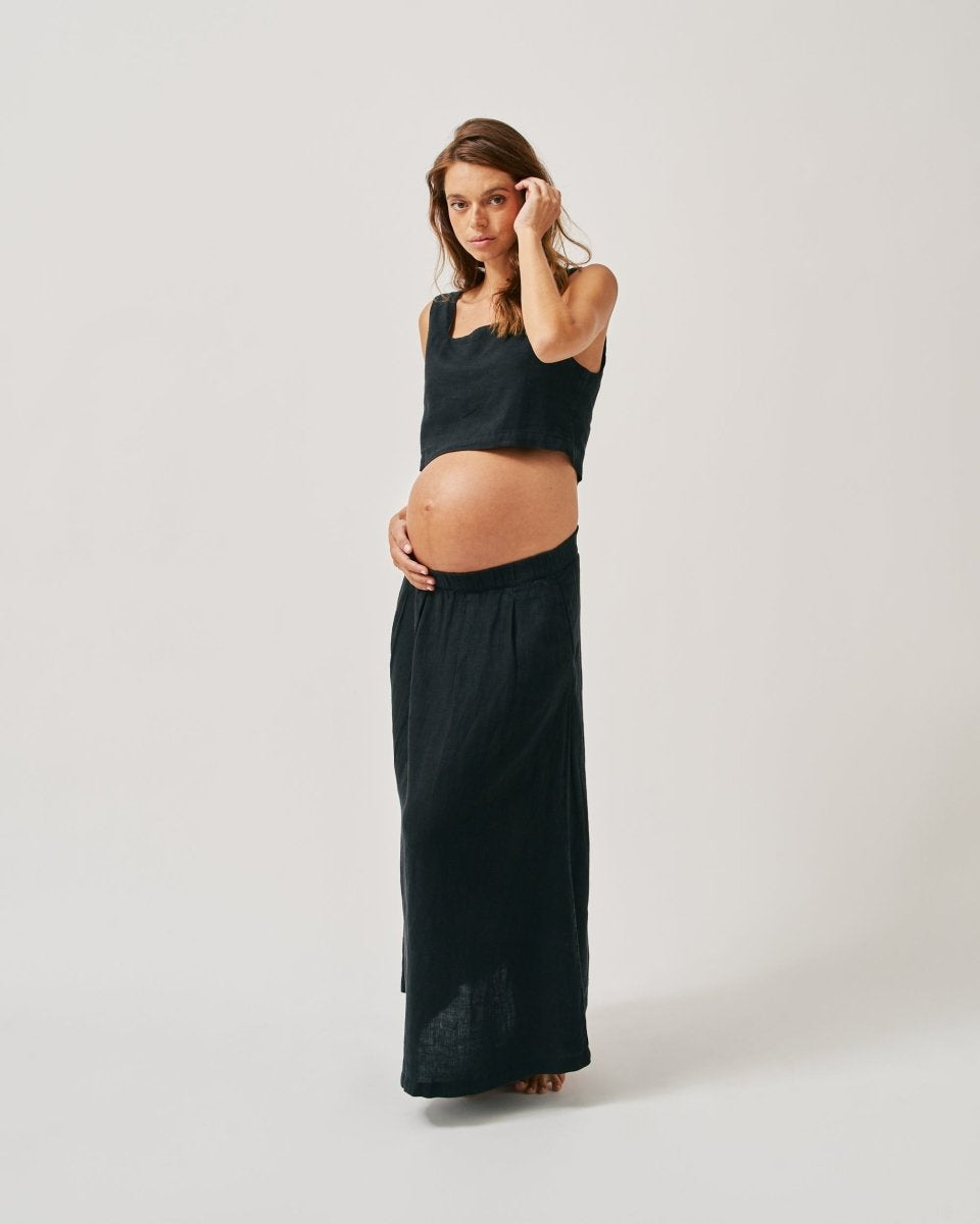 The Linen Maxi Skirt's flattering A-Line shape makes it friendly for a growing bump, should you be between sizes choose the larger size.