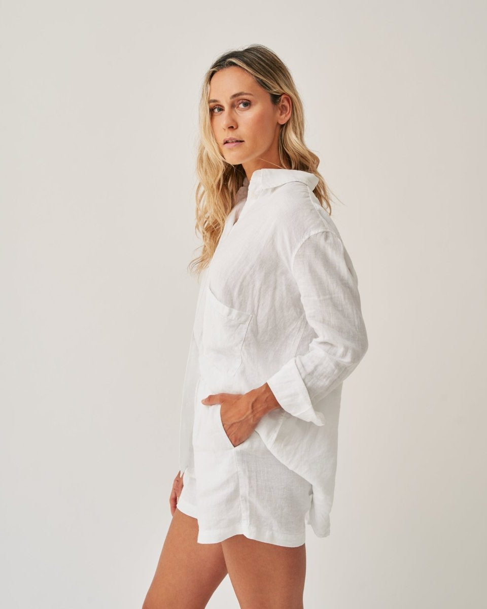 The Oversized Linen Shirt is a timeless wardrobe staple, offering a relaxed fit through the body and the sleeves, with a front low-pocket detail.